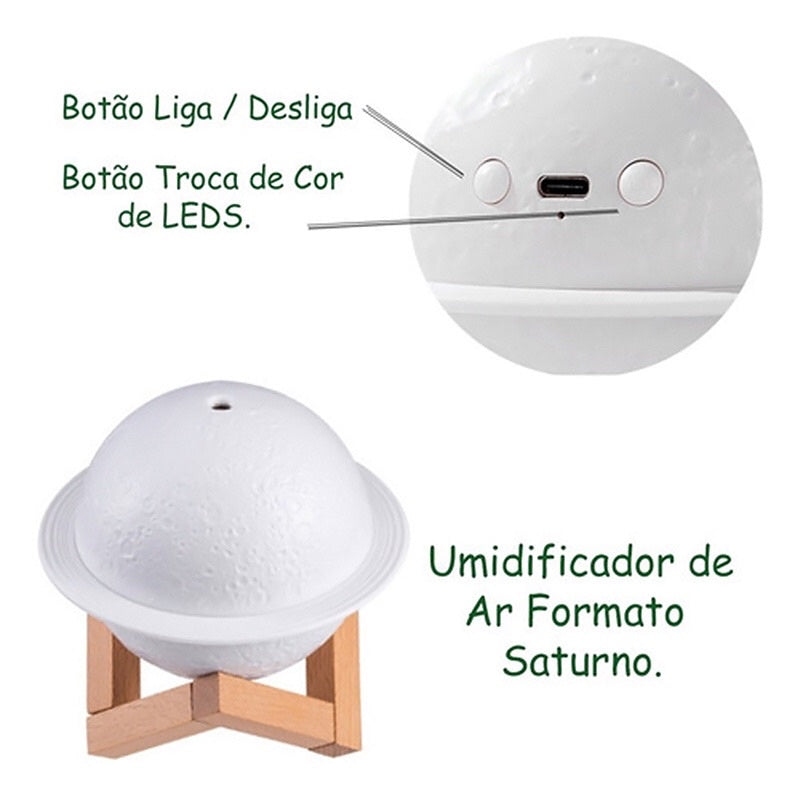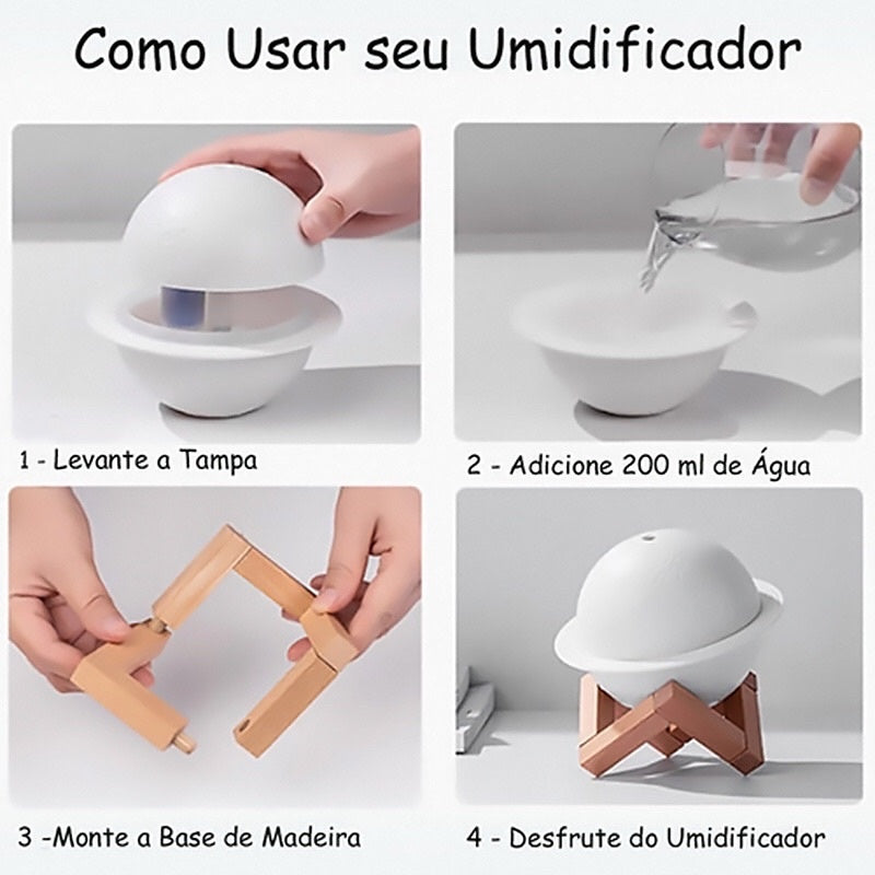 O umidificador conta com 200ml de água e iluminação LED que deixam o ambiente relaxado e aconchegante.