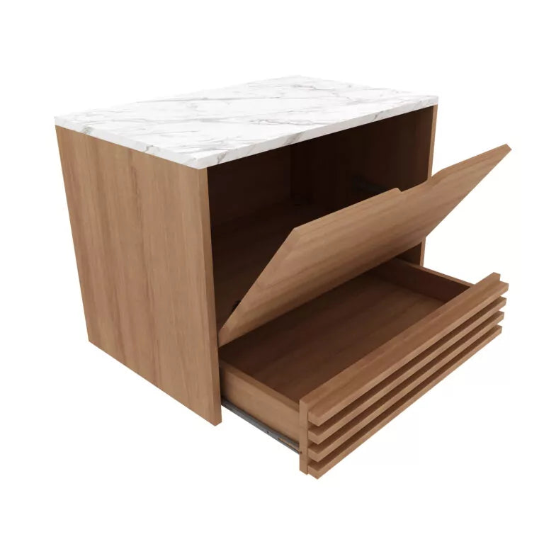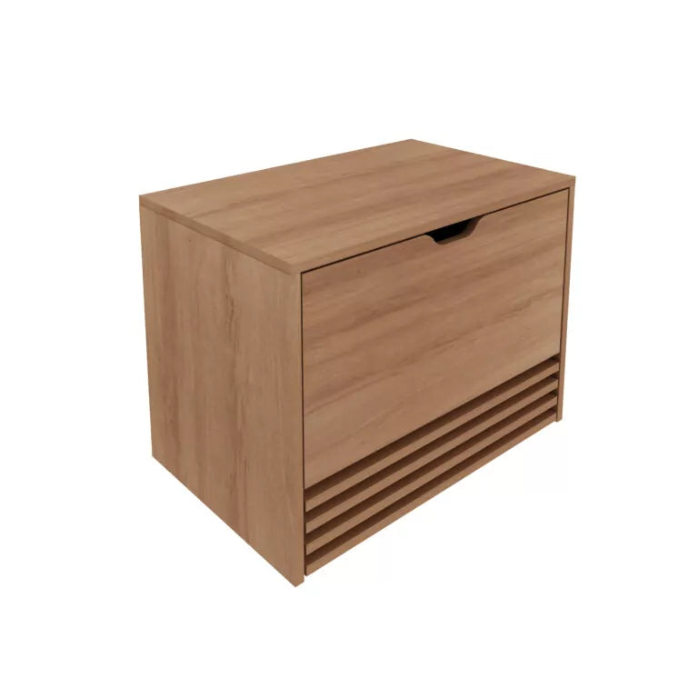 O móvel possui uma gaveta, uma porta com detalhe ripado, é feito com estrutura em MDP e possui acabamento em BP.