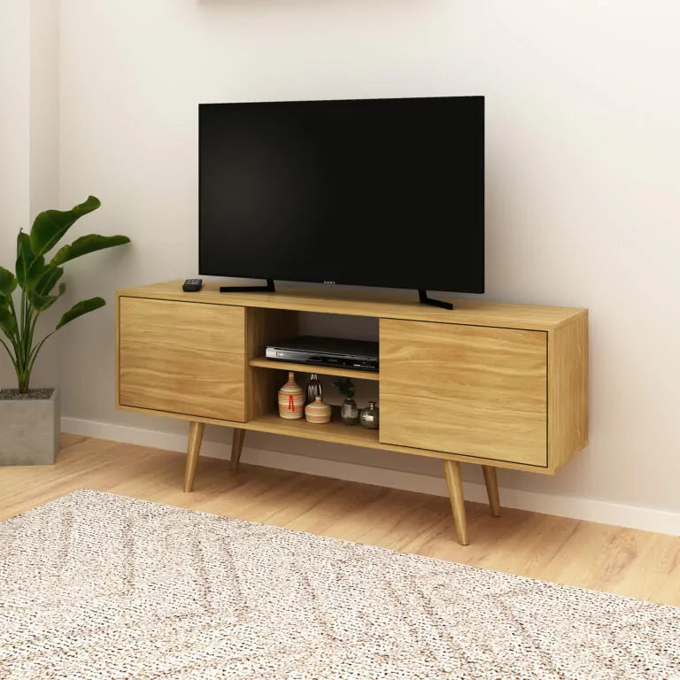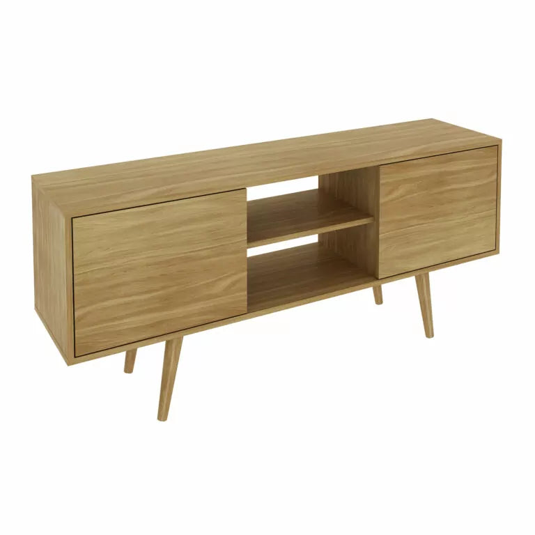Rack R1464, possui pé palito em madeira de eucalipto, nicho e duas portas, estrutura em MDP. Na cor Natural com acabamento em pintura UV e também na opção Natural | Palha com acabamento em impressão palha texturizada na frente das portas. Ideal para televisor de 42”.