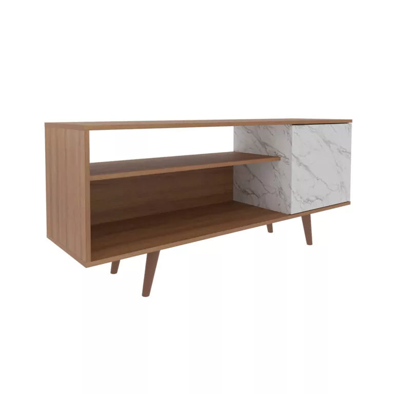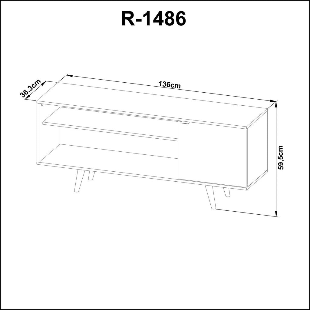 O Rack R1486 possui pé palito cônico, duas prateleiras laterais amplas e uma portas de abrir com detalhes em sobre cor na porta, sua estrutura é feita de MDP e seu acabamento em pintura UV. Ideal para televisor de até 42''